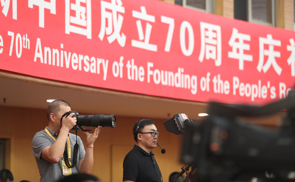 9月27日,慶祝中華人民共和國成立70周年活動新聞中心在梅地亞中心二層新聞發(fā)布廳舉辦第三場新聞發(fā)布會,中央農村工作領導小組辦公室主任、農業(yè)農村部部長韓長賦,國務院扶貧開發(fā)領導小組辦公室主任劉永富介紹全面建成小康社會,扎實推進脫貧攻堅和鄉(xiāng)村振興,并回答記者提問。圖為采訪拍攝發(fā)布會的記者。新華網 陳杰 攝