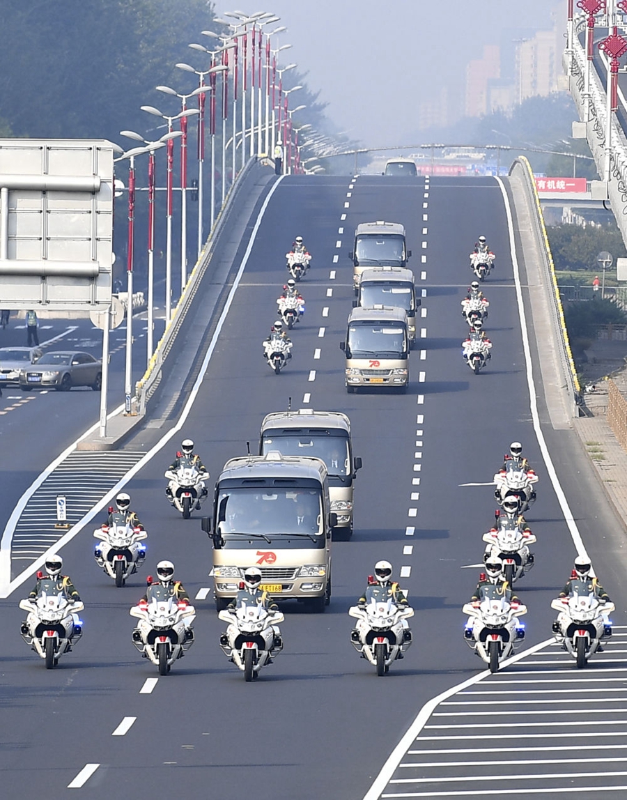 29日上午,國家勛章和國家榮譽(yù)稱號獲得者集體乘坐禮賓車從住地出發(fā),在英姿颯爽的國賓護(hù)衛(wèi)隊護(hù)衛(wèi)下,匯成一列車隊,向人民大會堂進(jìn)發(fā)。