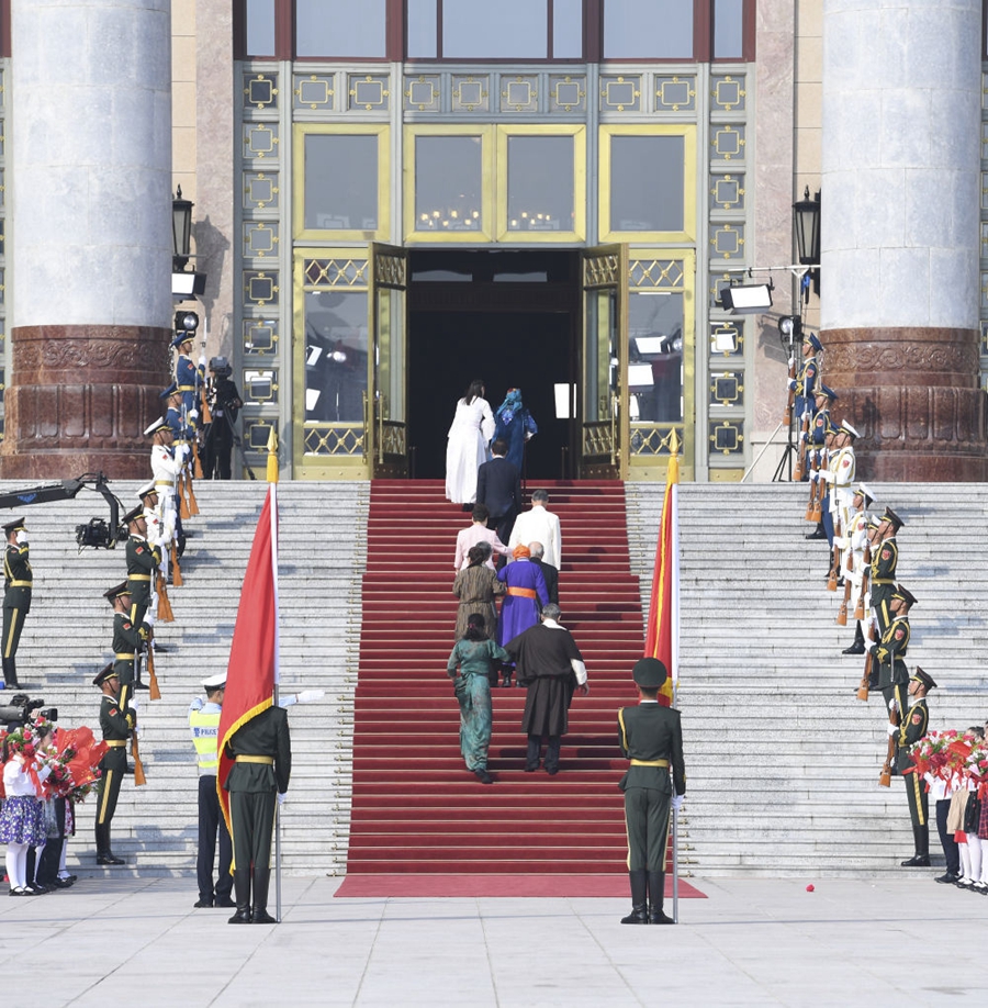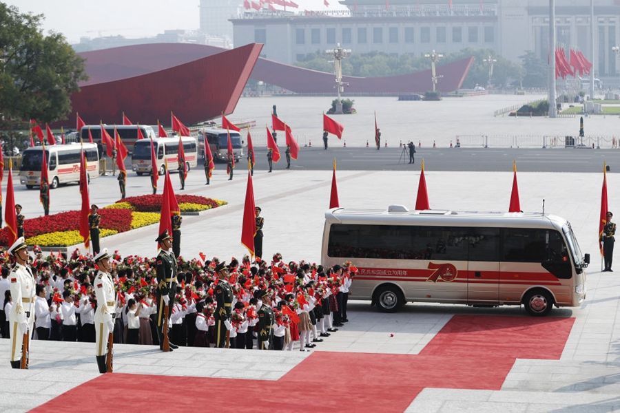 人民大會堂東門外,高擎紅旗的禮兵分列道路兩側(cè),肩槍禮兵在臺階上莊嚴(yán)佇立。車隊抵達(dá)時,早已迎候在這里的青少年們迸發(fā)出熱情的歡呼。