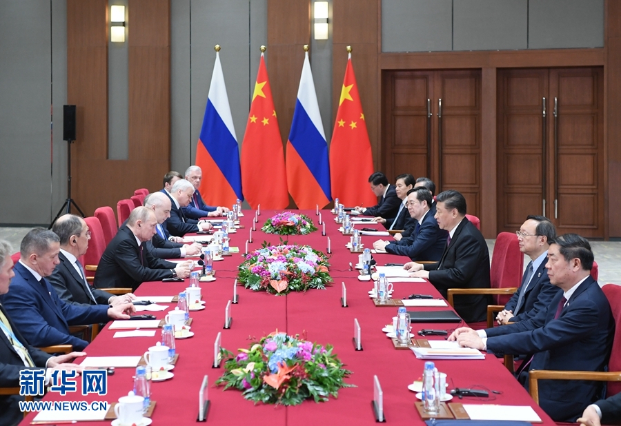 習(xí)近平強調(diào),當(dāng)前國際形勢復(fù)雜深刻演變,中俄雙方都致力于實現(xiàn)各自國家發(fā)展和民族振興,面臨共同的任務(wù)和挑戰(zhàn)。我們要始終將彼此視為重要發(fā)展機遇,相互支持,相互借力,實現(xiàn)同步振興,攜手構(gòu)建人類命運共同體。俄羅斯是共建“一帶一路”倡議重要的合作伙伴。共建“一帶一路”倡議同歐亞經(jīng)濟聯(lián)盟對接是區(qū)域經(jīng)濟合作的典范。下階段,雙方要繼續(xù)推進(jìn)經(jīng)貿(mào)、能源、科技、航天、互聯(lián)互通、地方、人文等領(lǐng)域合作。中方將向俄方提供一對大熊貓開展合作研究。