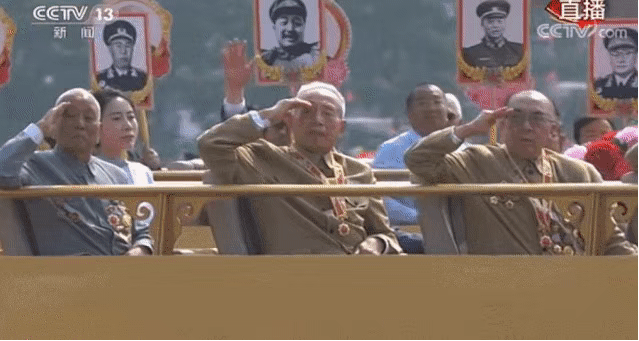 ?一曲《紅旗頌》奏響,當(dāng)“致敬方陣”的禮賓車(chē)上,老一輩黨和國(guó)家、軍隊(duì)領(lǐng)導(dǎo)人親屬代表,老一輩建設(shè)者和親屬代表,新中國(guó)成立前參加革命工作的老戰(zhàn)士,老一輩軍隊(duì)退役英模、民兵英模和支前模范代表等從天安門(mén)前經(jīng)過(guò)時(shí),全場(chǎng)所有人自發(fā)起立,向英雄們致以崇高的敬意?! ?
