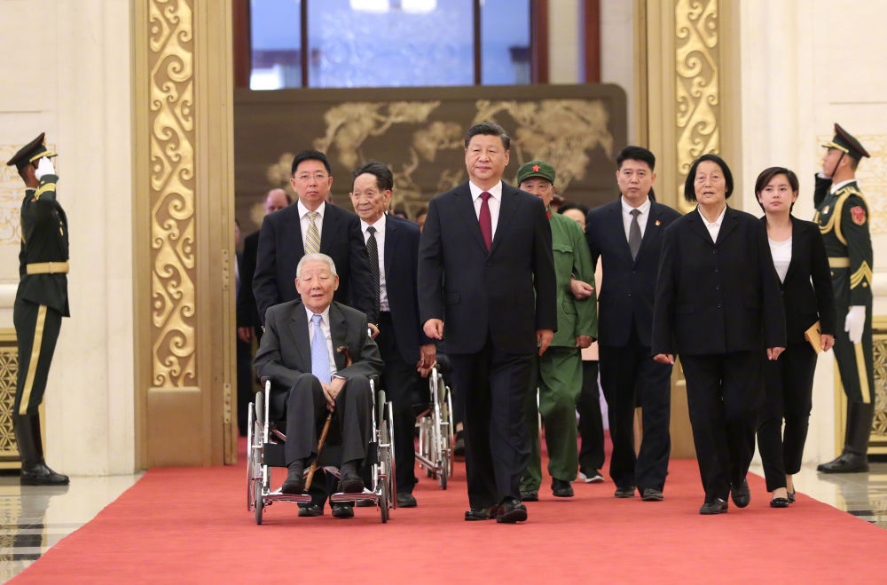 ?萬(wàn)眾矚目之下,習(xí)近平總書(shū)記同他們一同步入會(huì)場(chǎng)。在雄壯激昂的《向祖國(guó)致敬》樂(lè)曲聲中,總書(shū)記為他們一一頒授勛章獎(jiǎng)?wù)拢H切握手、表示祝賀。