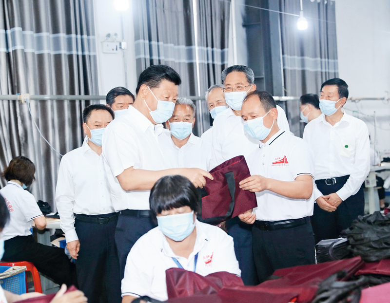 2020年8月18日至21日,中共中央總書記、國家主席、中央軍委主席習近平在安徽省考察。這是18日下午,習近平在阜陽市阜南縣紅亮箱包有限公司察看車間生產線,了解企業(yè)災后恢復生產和受災群眾、貧困群眾就業(yè)情況。 新華社記者 鞠鵬/攝
