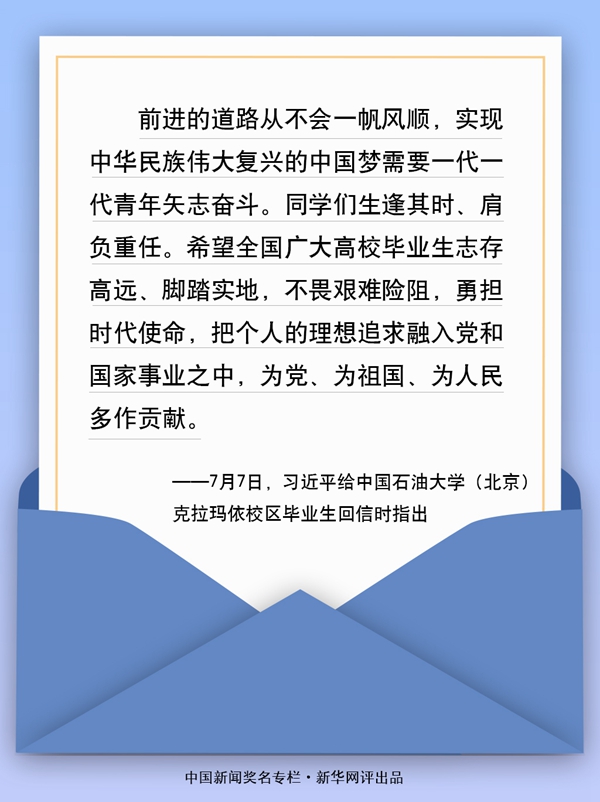 近日,中國(guó)石油大學(xué)(北京)克拉瑪依校區(qū)的118名畢業(yè)生給習(xí)近平總書記寫信,匯報(bào)了大學(xué)四年學(xué)習(xí)和思想上的收獲,表達(dá)了扎根西部、建設(shè)邊疆的堅(jiān)強(qiáng)決心??倳浕匦趴隙ㄋ麄兊竭吔鶎庸ぷ鞯倪x擇,并對(duì)廣大高校畢業(yè)生提出殷切期望。