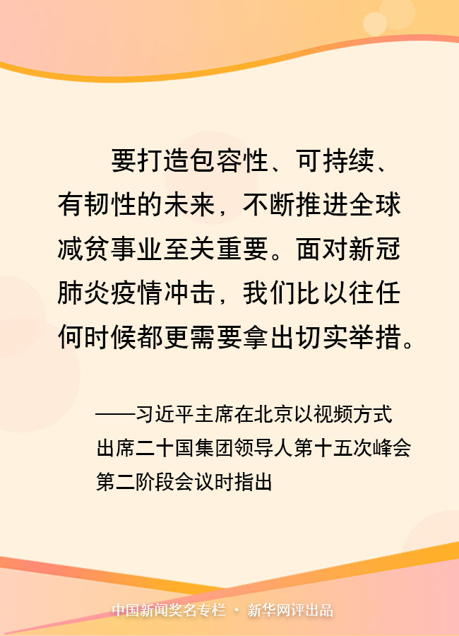 11月22日晚,習(xí)近平主席在北京以視頻方式出席二十國集團領(lǐng)導(dǎo)人第十五次峰會第二階段會議,重點闡述關(guān)于可持續(xù)發(fā)展問題的看法。他指出,要打造包容性、可持續(xù)、有韌性的未來,不斷推進全球減貧事業(yè)至關(guān)重要。面對新冠肺炎疫情沖擊,我們比以往任何時候都更需要拿出切實舉措。