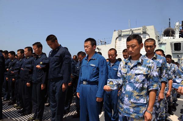 中國(guó)海軍護(hù)航編隊(duì)舉行默哀儀式悼念舟曲特大山洪泥石流遇難同胞