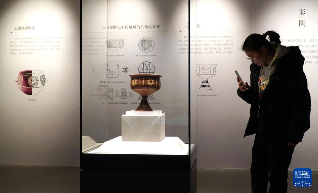 2月9日,在孔子博物馆举行的山东文物精品展上,参观者在观看山东省文物考古研究院收藏的大汶口文化八角星纹彩陶豆。