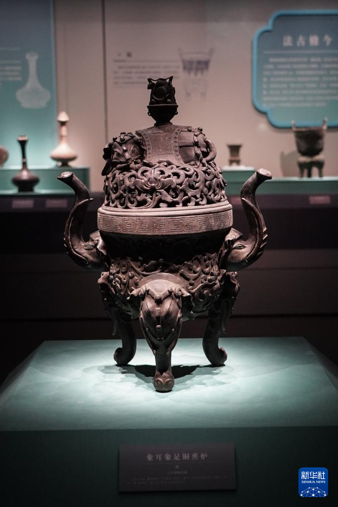 这是展览上陈列的清代象耳象足铜熏炉(11月22日摄)。