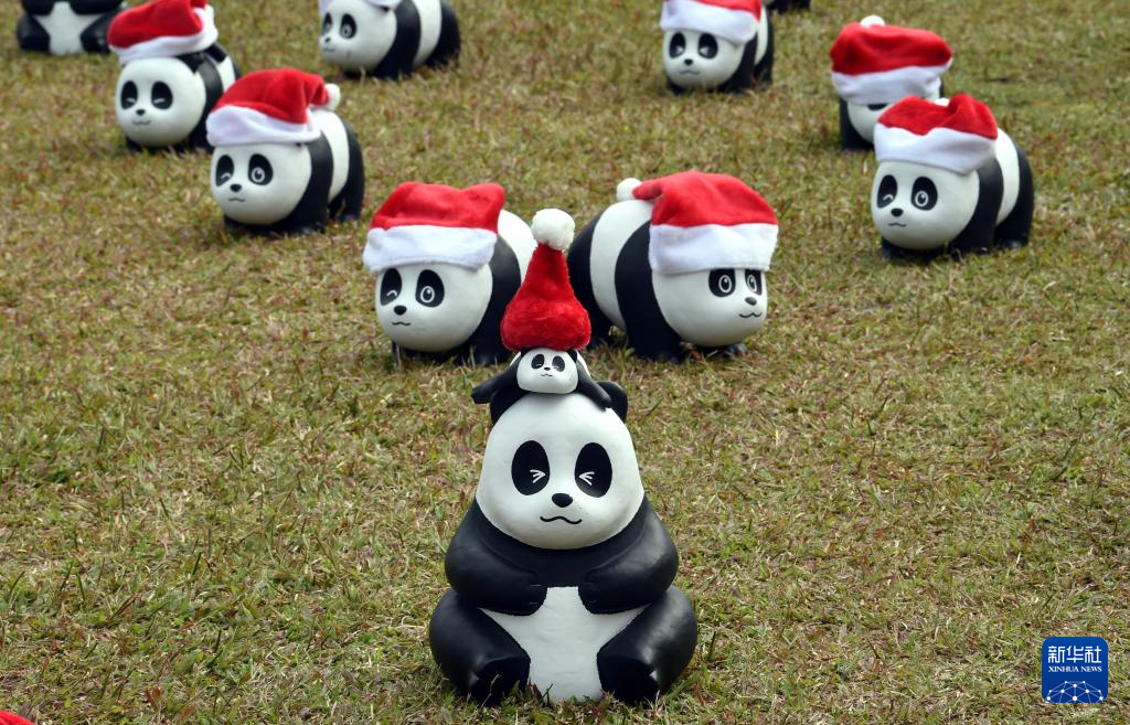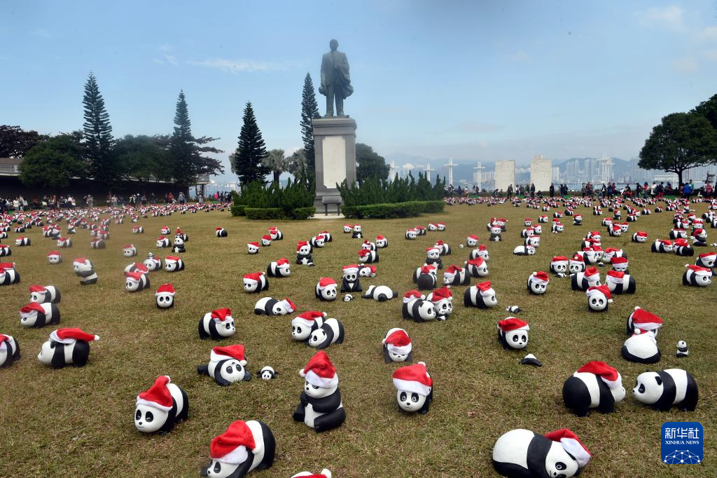 12月25日,大熊猫雕塑在香港中山纪念公园草地上展出。