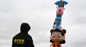 3月8日,在新疆都拉塔口岸房车露营基地,风筝爱好者放飞风筝。