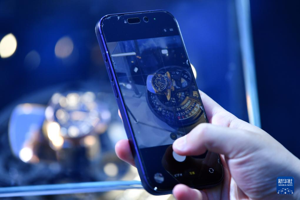 4月14日,在瑞士日内瓦举行的“钟表与奇迹”高级钟表展上,参观者拍摄展品。
