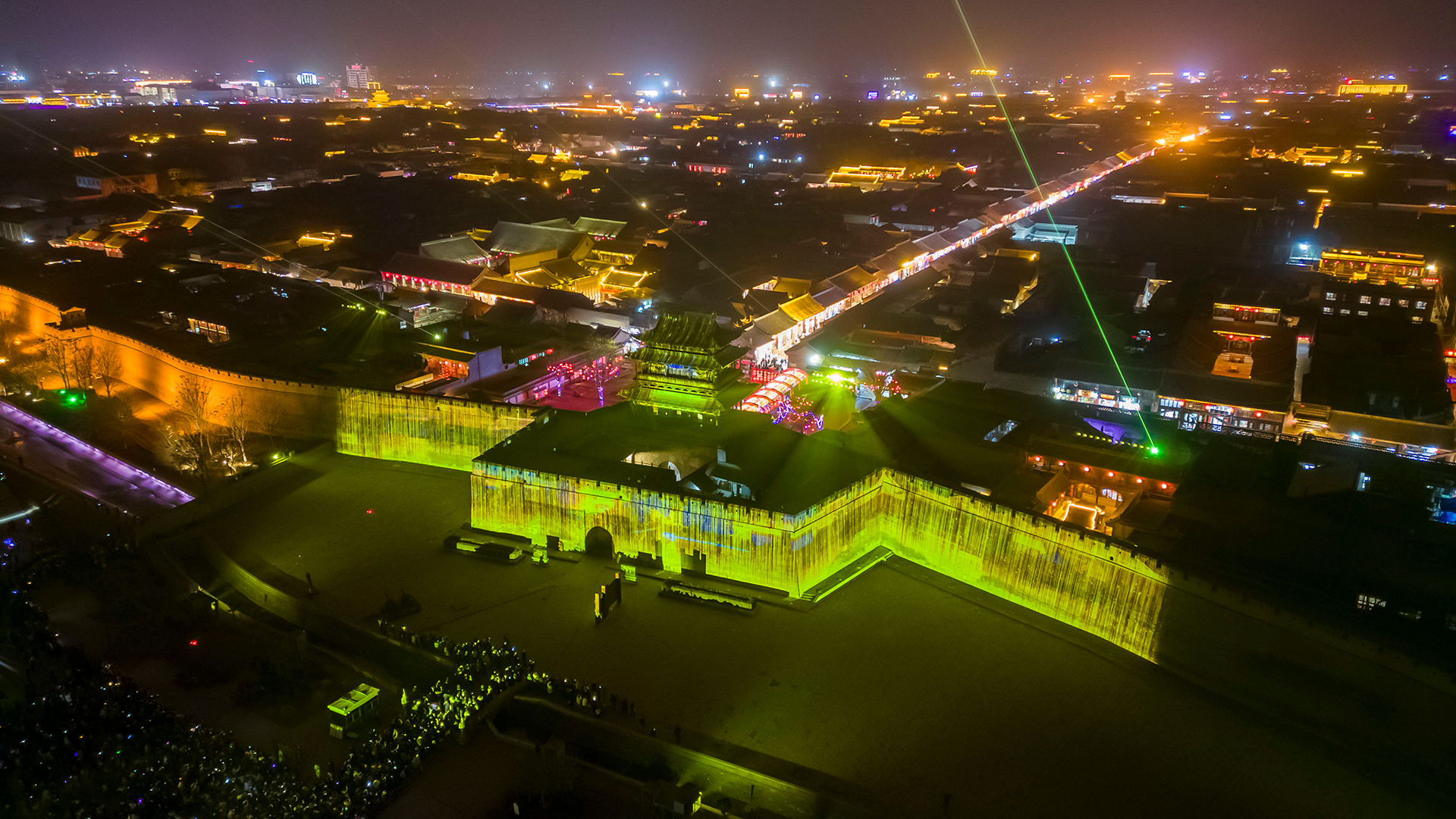 古城夜宴,光影流转映城楼,流光溢彩醉游人