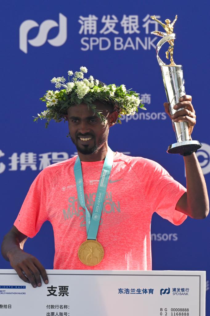 11月30日,男子组冠军埃塞俄比亚选手米尔克萨·门格沙在颁奖仪式上。新华社记者 陈浩明 摄