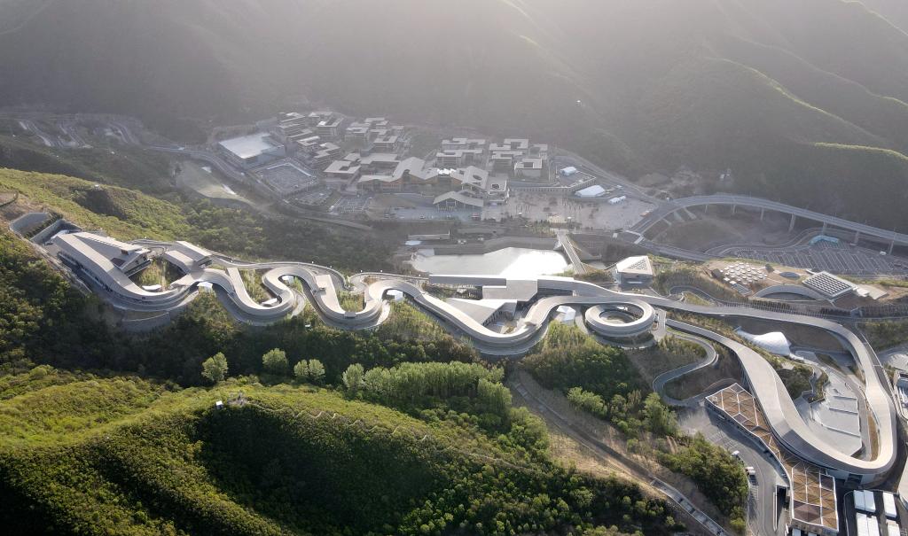 这是2022年4月26日拍摄的国家雪车雪橇中心(下)和冬奥村(上)(无人机照片)。新华社记者 张晨霖 摄