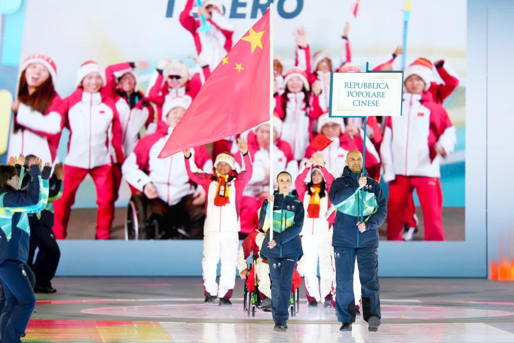 当地时间3月6日,2026年米兰-科尔蒂纳冬残奥会开幕式在意大利维罗纳竞技场举行。图为中国代表团在开幕式上入场。新华社记者 李京 摄