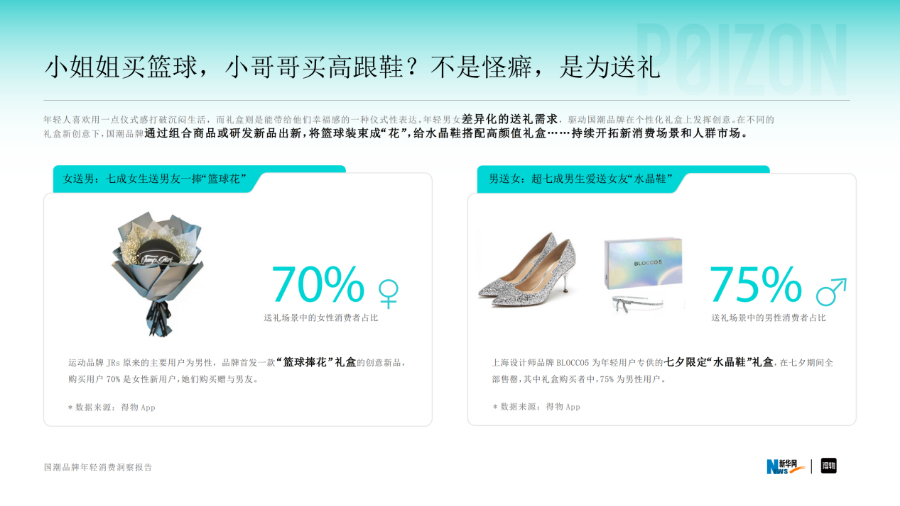 新国潮品牌通过钻研年轻人的生活需求细节,推动多样的创意新品研发与灵活供给。无论是被年轻人当潮流配饰的“耳机”,还是仅凭一款单品跃居行业黑马的“剃须刀”;70%女生买的“篮球捧花”,还是75%男生买的“水晶鞋”;把平平无奇的“磁铁”设计成13万小情侣秀恩爱的“手链”,还是上架即必买的“颈椎按摩器”……《报告》通过一系列品牌案例,展示了国潮品牌被年轻人生活细节点亮灵感后的上新“群像”。更有一些从外观、设计到核心技术都自主研发的“中国原创”品牌,在问鼎国际权威大奖同时,在得物App频登新品热榜,收获大批年轻粉丝。