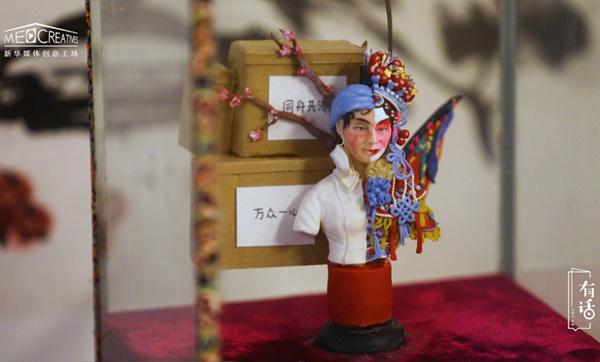 面塑俗稱面人,因?yàn)樗饕念}材都是人物,所以老百姓們也管它叫面人。這個(gè)是“三八婦女節(jié)”那天做的,我看到當(dāng)時(shí)有很多的醫(yī)護(hù)人員作為人類的代表跟另外一個(gè)物種去斗爭(zhēng)、保護(hù)我們,覺(jué)得她們還真的是很了不起的。想到以前巾幗英雄里邊穆桂英這個(gè)角色,加上京劇也是我們傳統(tǒng)文化中很寶貴的一個(gè)部分,就把這兩個(gè)結(jié)合在一起做了一個(gè)拼臉。