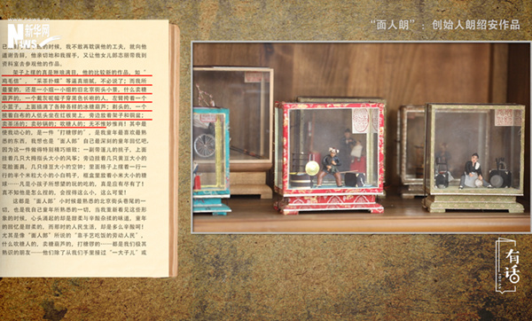 冰心先生的《小桔燈》散文集中,有一篇叫作《“面人郎”訪問(wèn)記》的文章:“架子上擺的真是琳瑯滿目,他的比較新的作品,如“雞毛信”,“采茶撲蝶”等逼真細(xì)膩,不必說(shuō)了;而我所最愛(ài)的,還是一小組一小組的舊北京街頭小景,什么賣糖葫蘆的,一個(gè)戴灰呢帽子穿黑色長(zhǎng)袍的人,左臂挎著一個(gè)小籃子,上面插滿了各種各樣的冰糖葫蘆;剃頭的,一個(gè)披著白布的人低頭坐在紅板凳上,旁邊放著架子和銅盆;賣茶湯的;賣砂鍋的;吹糖人的;無(wú)不惟妙惟肖!”在文章當(dāng)中,冰心先生也提到了,最令她心動(dòng)的是一個(gè)打糖鑼的,這是她童年最喜歡、最熟悉的東西,她認(rèn)為這也是“面人郎”最深刻的童年回憶。