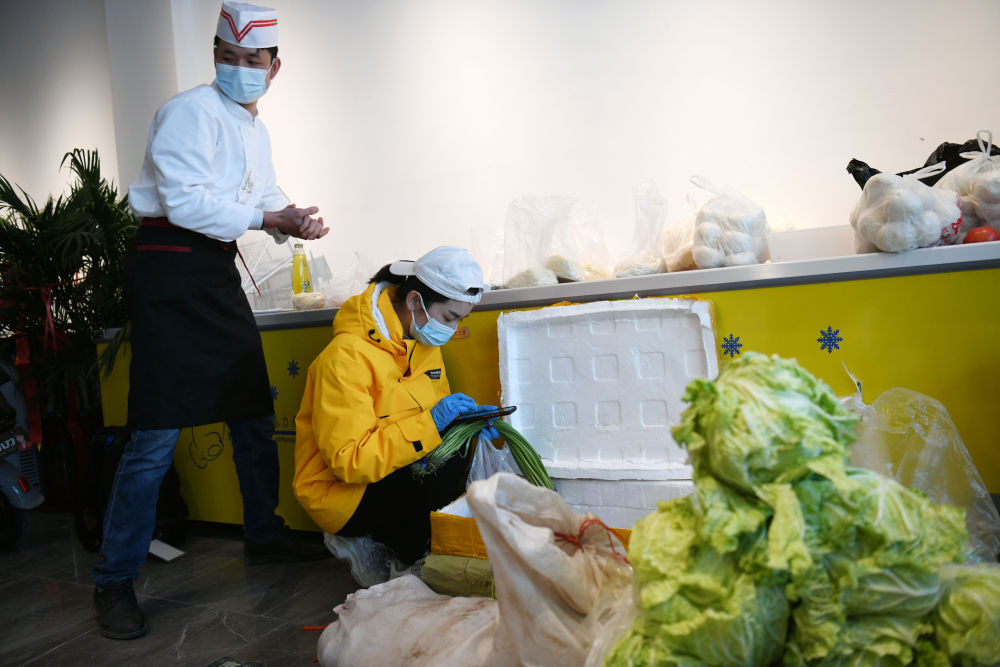 ↑1月11日,汪新建(左)和張琪琪夫婦在準(zhǔn)備給鄰居們送菜。生活在河北石家莊市玉蘭苑小區(qū)的夫婦二人,在小區(qū)門口開了一家餐廳,夫妻倆帶著廚師和司機,為社區(qū)的工作人員免費提供盒飯,義務(wù)給鄰居們跑腿買菜。