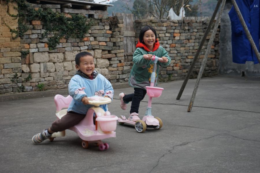 下午,王滿香又來到了另一戶留守兒童家中。剛進(jìn)門,4歲的清伊(化名)和2歲的弟弟就騎著滑板車開心地圍著她轉(zhuǎn)起了圈。“今天乖不乖?看看童伴媽媽給你帶了什么禮物?”王滿香拿起手中的粉色書包向小女孩打招呼。
