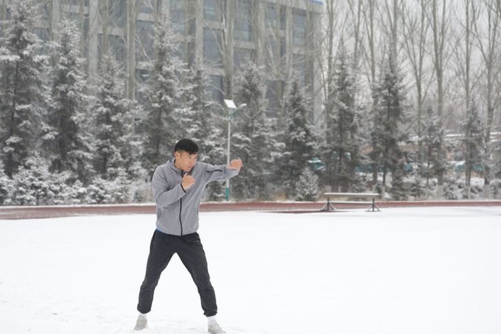 天微亮,田徑場上已鋪滿積雪。跑道中央站著一名身著灰色運動服的小伙兒,只見他向空氣中揮出一拳又一拳,地上也留下了一圈圈腳印……