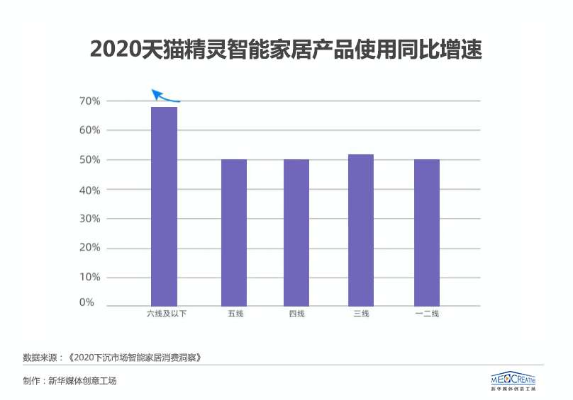 根據(jù)《2020下沉市場智能家居消費洞察》顯示,50%以上的天貓精靈智能家居使用者在三到六線城市,其中六線城市用戶增速最快,四線城市銷量、銷售額增長最快,下沉市場正在成為智能家居行業(yè)的新藍海。同時,根據(jù)天貓平臺數(shù)據(jù)顯示,智能開關(guān)、智能落地?zé)簟⒅悄茈娬粝涞葍r格在50元到300元之間的小家電,在下沉市場年銷量同比增速均超過300%,也側(cè)面佐證著這一現(xiàn)象。
