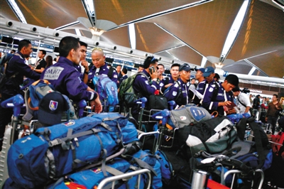 當(dāng)?shù)貢r(shí)間7月18日,馬來西亞國際機(jī)場(chǎng),馬來西亞派特殊救災(zāi)和救援小組成員前往MH17墜機(jī)事故現(xiàn)場(chǎng)。圖/CFP