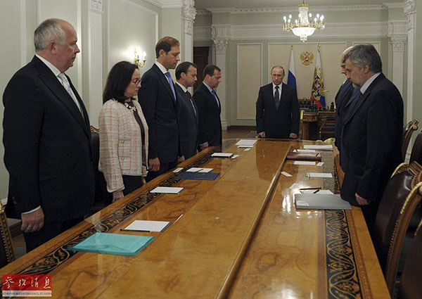 7月17日夜,在俄羅斯莫斯科州新奧加廖沃官邸,俄羅斯總統(tǒng)普京(后)和一些高級(jí)別官員在經(jīng)濟(jì)問(wèn)題會(huì)議前為墜毀馬航MH17航班的遇難者默哀。普京當(dāng)晚說(shuō),馬航客機(jī)失事悲劇發(fā)生在烏克蘭領(lǐng)空,烏克蘭無(wú)疑對(duì)此承擔(dān)責(zé)任。