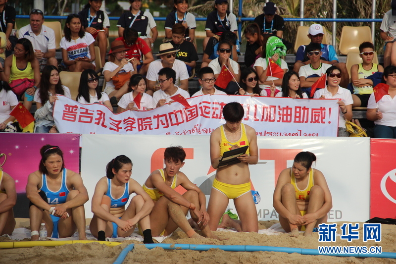 ??? 11月16日,中國(guó)沙灘手球運(yùn)動(dòng)員們比賽中場(chǎng)休息。中國(guó)體育代表團(tuán)16日在泰國(guó)普吉舉行的第四屆亞洲沙灘運(yùn)動(dòng)會(huì)上勇奪2枚金牌和2枚銅牌。當(dāng)天比賽全部結(jié)束時(shí),中國(guó)隊(duì)以3金2銀5銅的成績(jī)暫列獎(jiǎng)牌榜第五。新華社發(fā)(塔納攝)