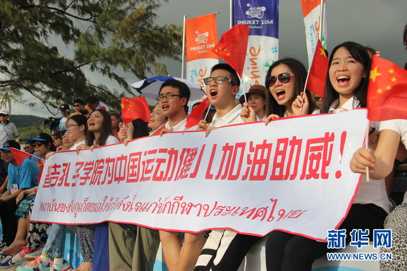 ??? 11月16日,普吉孔子學(xué)院的中國志愿者老師們?yōu)橹袊\動健兒加油。中國體育代表團16日在泰國普吉舉行的第四屆亞洲沙灘運動會上勇奪2枚金牌和2枚銅牌。當(dāng)天比賽全部結(jié)束時,中國隊以3金2銀5銅的成績暫列獎牌榜第五,東道主泰國隊以9金11銀12銅的成績暫列金牌榜和獎牌榜第一。新華社記者楊云燕攝