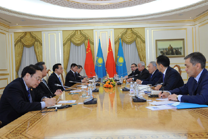 李克強(qiáng)會見哈薩克斯坦總統(tǒng)納扎爾巴耶夫。新華社 饒愛民 攝