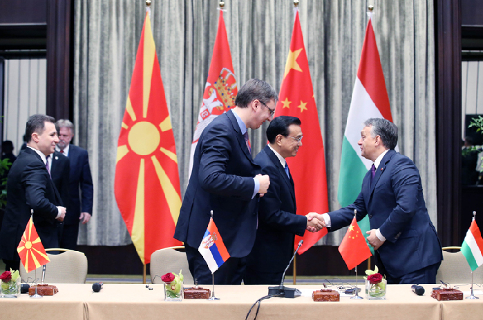 李克強(qiáng)與塞爾維亞、匈牙利、馬其頓三國總理共見記者。新華社 姚大偉 攝