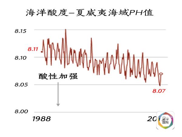 美國(guó)國(guó)家海洋和大氣管理局?jǐn)?shù)據(jù)顯示,海洋平均pH值已經(jīng)從工業(yè)革命之前的8.21,變?yōu)槿缃竦牟坏?.1。這一數(shù)值變化表明,海水的酸度升高了大約30%。