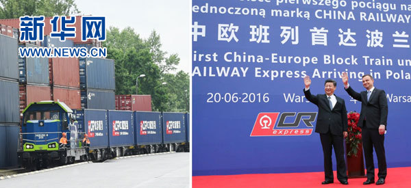 6月20日,國家主席習近平同波蘭總統(tǒng)杜達在華沙共同出席統(tǒng)一品牌中歐班列首達歐洲(波蘭)儀式。左圖:帶有統(tǒng)一標識的中歐班列鳴笛緩緩駛入站臺;右圖:兩國元首向班列揮手致意(拼版照片)。新華社記者 謝環(huán)馳 蘭紅光 攝