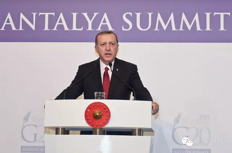 ??? 2015年11月,G20峰會在土耳其安塔利亞舉行,從安塔利亞到杭州,從地中海岸到錢塘江畔,與東道主接力棒一樣順利傳遞的,是對推動全球經(jīng)濟穩(wěn)步復蘇、實現(xiàn)可持續(xù)增長的決心?!敖影簟焙蟮闹袊谧h題設置上既汲取了安塔利亞峰會的智慧成果,又著眼當前、旨在長遠、彰顯新意。 2015年G20安塔利亞峰會上的埃爾多安總統(tǒng)↓