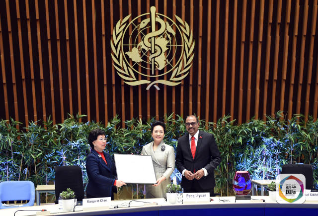 1月18日,國(guó)家主席習(xí)近平夫人、世界衛(wèi)生組織結(jié)核病和艾滋病防治親善大使彭麗媛應(yīng)世界衛(wèi)生組織總干事陳馮富珍和聯(lián)合國(guó)艾滋病規(guī)劃署執(zhí)行主任西迪貝邀請(qǐng),在瑞士日內(nèi)瓦出席為她舉行的親善大使任期續(xù)延暨頒獎(jiǎng)儀式。這是世界衛(wèi)生組織總干事陳馮富珍向彭麗媛頒發(fā)世衛(wèi)組織榮譽(yù)勛章。(新華社記者謝環(huán)馳攝)