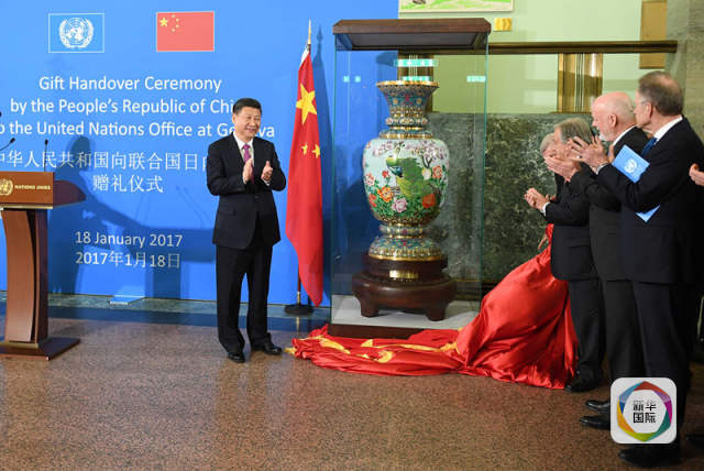 1月18日,國家主席習(xí)近平在瑞士日內(nèi)瓦萬國宮出席“共商共筑人類命運共同體”高級別會議,并發(fā)表題為《共同構(gòu)建人類命運共同體》的主旨演講。這是會議結(jié)束后,習(xí)近平出席中國向聯(lián)合國日內(nèi)瓦總部贈禮儀式。(新華社記者張鐸攝)