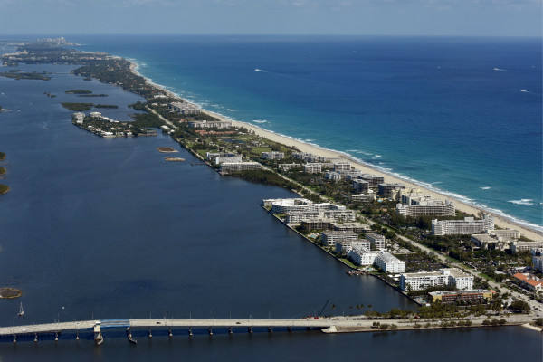 這是2017年3月20日航拍的美國佛羅里達(dá)州棕櫚灘的海岸線,海湖莊園就在這個狹長的小島上。(新華社記者殷博古攝)