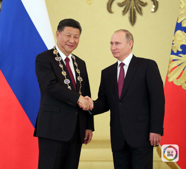 7月4日,國(guó)家主席習(xí)近平在莫斯科克里姆林宮同俄羅斯總統(tǒng)普京舉行會(huì)談。這是會(huì)談后,普京向習(xí)近平授予俄羅斯國(guó)家最高勛章“圣安德烈”勛章。新華社記者 劉衛(wèi)兵 攝