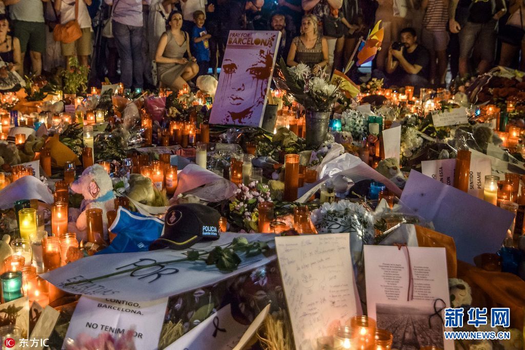 當?shù)貢r間2017年8月18日,西班牙巴塞羅那,當?shù)孛癖婞c燭獻花悼念恐襲事件遇難者。17日,一輛白色貨車在巴塞羅那市中心蘭布拉大道加泰羅尼亞廣場附近沖撞人群,據(jù)媒體報道,死亡人數(shù)已經升至14人。(圖片來源:東方IC)