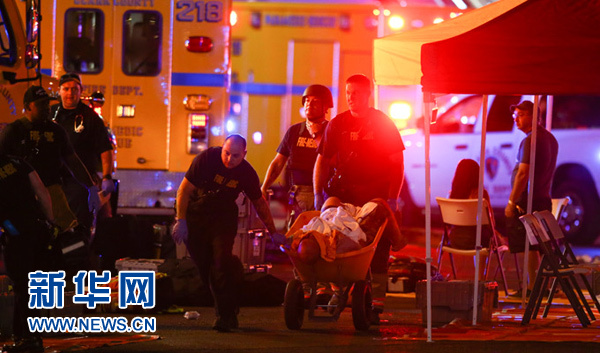 10月1日,在美國西部城市拉斯維加斯,工作人員在槍擊事件現(xiàn)場(chǎng)救治傷者。新華社/美聯(lián)