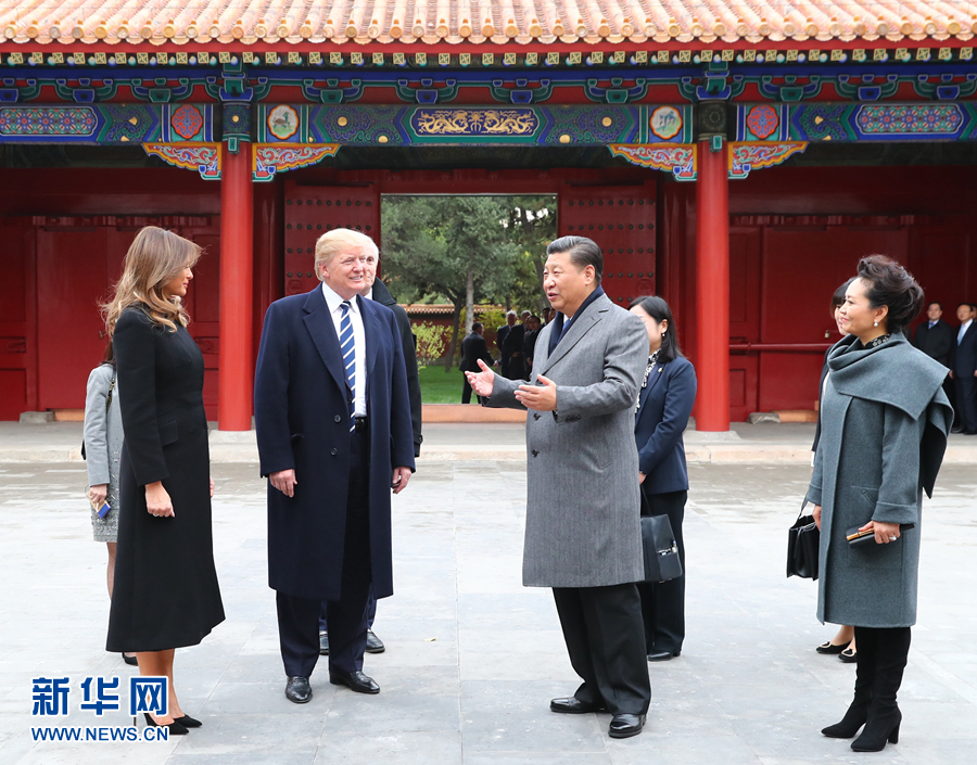 11月8日下午,國家主席習(xí)近平和夫人彭麗媛在北京故宮博物院迎接來華進(jìn)行國事訪問的美國總統(tǒng)特朗普和夫人梅拉尼婭。兩國元首夫婦在寶蘊(yùn)樓簡短茶敘。新華社記者 謝環(huán)馳 攝
