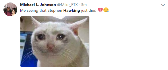 有網(wǎng)友在社交媒體平臺(tái)推特發(fā)文“剛剛看到霍金去世的消息”,并配上了哭泣的圖片?!?/p>