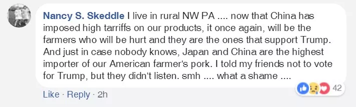我住在賓州西北部農(nóng)村…中國已對我們的產(chǎn)品加征關(guān)稅,曾支持特朗普的農(nóng)民會再次受傷……我告訴過我的朋友不要給特朗普投票,但他們不聽。哎,太無語了……