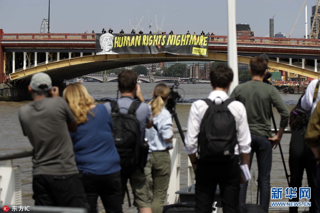 7月12日,英國(guó)倫敦,國(guó)際特赦組織成員在倫敦泰晤士河上沃克斯豪爾橋懸掛橫幅,抗議美國(guó)總統(tǒng)特朗普到訪英國(guó)。(圖片來(lái)源:東方IC)
