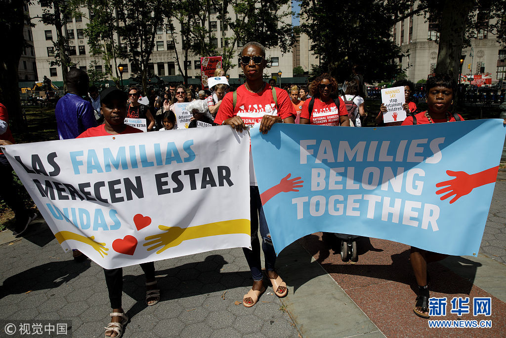 當?shù)貢r間2018年7月18日,美國紐約,包括托兒所從業(yè)人員、父母及其子女在內(nèi)的社會各界人士在美國移民和海關(guān)執(zhí)法局(ICE)附近組織示威游行,抗議特朗普政府近期在美國南部邊境實施針對非法移民家庭的強制拘留和家庭成員離散政策。 當天,共和黨領(lǐng)導(dǎo)的眾議院通過了支持ICE的決議,并譴責(zé)一些民主黨人和進步積極分子要求廢除ICE的呼聲。(圖片來源:視覺中國)