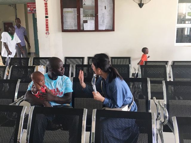 2018年7月18日,中國援建塞內加爾兒童醫(yī)院候診室,蘇利曼·費迪奧爾抱著孩子接受記者采訪。(新華社記者蔣國鵬攝)