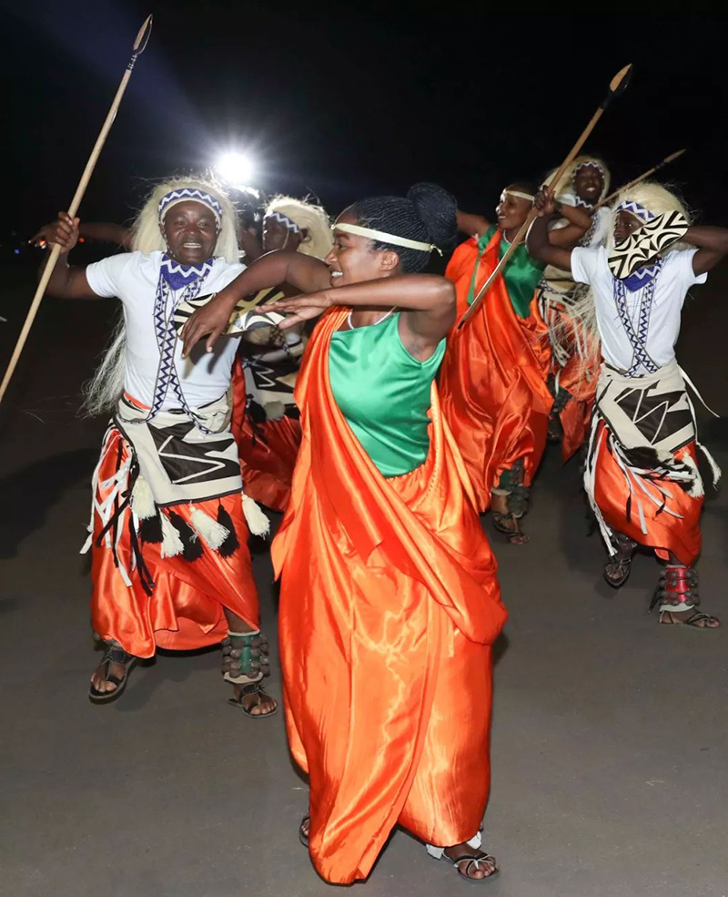 盛裝禮兵英姿挺拔,向尊貴的客人行注目禮。鼓聲響起,盧旺達(dá)民眾身著靚麗民族服裝,跳起熱情的迎賓舞,時(shí)而舒展柔緩,時(shí)而剛健有力。兩國(guó)元首駐足觀看,揮手致意。