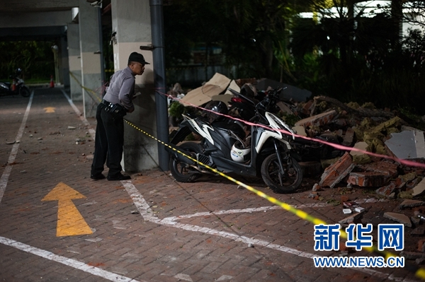 8月5日,在印度尼西亞西努沙登加拉省龍目島以西的巴厘島,一名安保人員查看一處停車場里的落石。 新華社發(fā)(穆罕默德·福齊·哈尼亞戈攝)