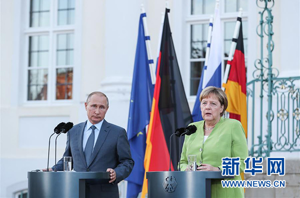 8月18日,在德國(guó)首都柏林以北小鎮(zhèn)梅澤貝格,德國(guó)總理默克爾(右)與來(lái)訪的俄羅斯總統(tǒng)普京共同出席新聞發(fā)布會(huì)。當(dāng)日,德國(guó)總理默克爾在梅澤貝格與來(lái)訪的俄羅斯總統(tǒng)普京舉行會(huì)談,雙方就烏克蘭局勢(shì)、敘利亞沖突以及“北溪-2”天然氣管道項(xiàng)目等棘手問(wèn)題進(jìn)行討論。新華社記者 單宇琦攝